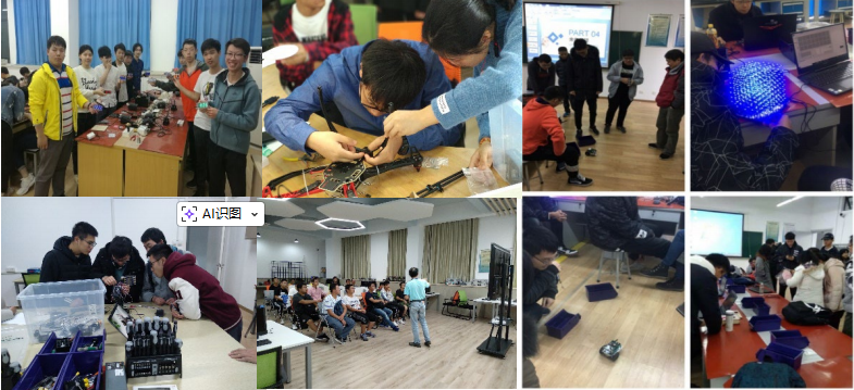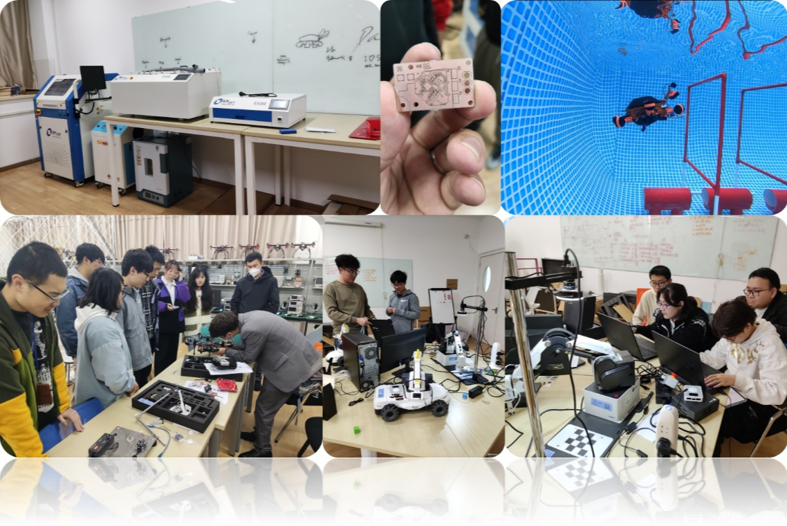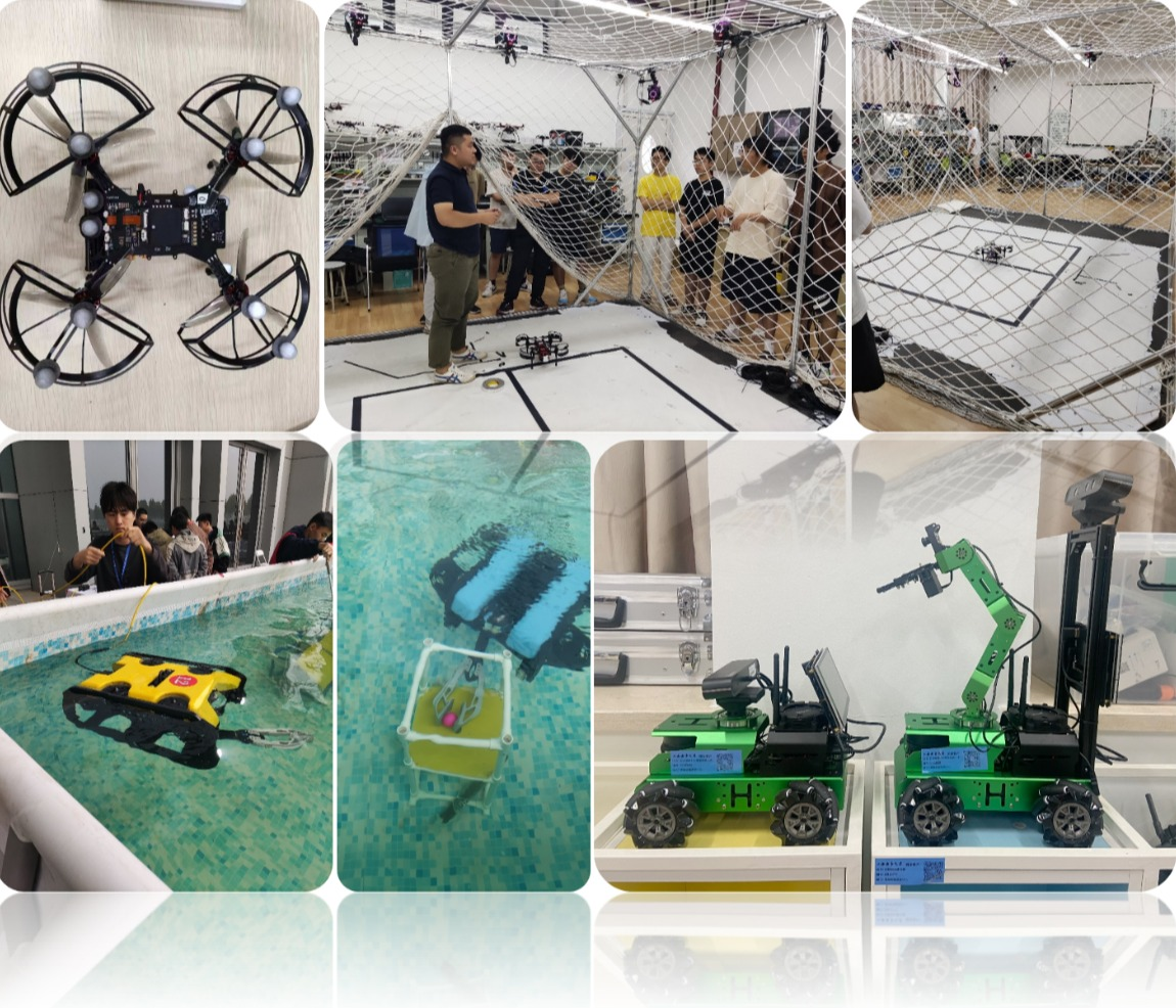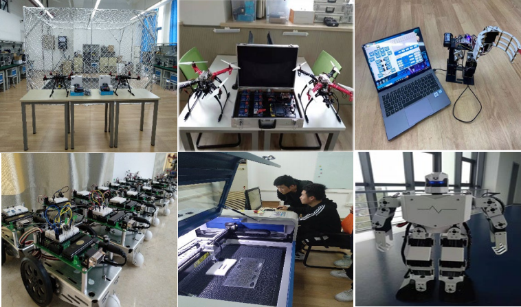 (6)2023年,E2创智天地创新实践平台的第五期建设,主要完成智能集群控制训练平台和智能协作机器人培养训练平台的建设。智能集群控制训练平台包括用于给无人机进行高精度室内定位的光学动作捕捉系统和地面无人驾驶SLAM导航小车,建立基于无人机、智能小车等为控制对象的空地协同的集群控制训练平台,主要培养学生在传感器应用、自主导航、集群算法研究、软件编写等实践技能的锻炼、实践实验课程的训练、学科竞赛训练、创新素质的培养,可助力科研项目及研究生的培养。智能协作机器人培养训练平台包括:AI视觉无人机蜂群开发平台、自主视觉ROS智能物流小车和水下负荷作业机器人等。建立通过智能检测、人机交互等方式实现智能加工、搬运、捕捞、装卸、维修等功能的多智能体智慧协作机器人训练平台,可用于学生在自动控制、人机交互、三维建模等实践技能的锻炼、实践实验课程的训练、学科竞赛训练与创新实践的培养,可实现远程控制操作,可应用于线上实践教学模式。