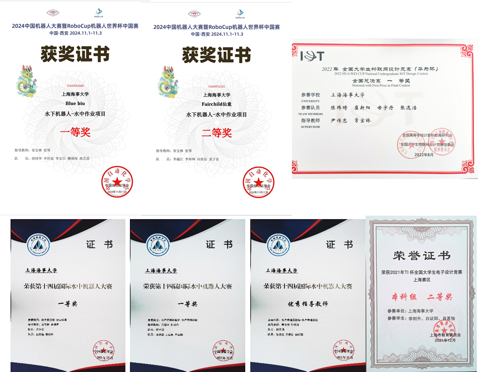 近五年来取得成绩 | 1. 2021年第十四届国际水中机器人大赛。2组同学获得全国一等奖;常宝林被评为优秀指导老师 2. 2021年TI杯全国大学生电子设计大赛无人机项目。1组同学获得上海市二等奖,1组同学获得上海市三等奖;常宝林被评为优秀指导老师 3. 2021年全国大学生物联网大赛,1组同学获得华东赛区二等奖;常宝林被评为优秀指导老师 4. 2021年第四届中国高校智能机器人创意大赛。1组同学获得全国三等奖; 5. 2021年荣获上海海事大学教学改革与建设成果—学科竞赛活动优秀指导教师一等奖; 6. 2022年第十五届国际水中机器人大赛。2组同学获得全国一等奖;常宝林被评为优秀指导老师; 7. 2022年TI杯全国大学生电子设计大赛无人机项目。1组同学获得上海市二等奖; 8. 2022年全国大学生物联网大赛,1组同学获得全国一等奖; 9. 2023年第十六届国际水中机器人大赛,1组同学获得全国二等奖; 10. 2023年中国机器人大赛,1组同获得全国二等奖; 11. 2023年TI杯全国大学生电子设计大赛,2组同学获得上海市二等奖 12. 2024年中国机器人大赛,1组同学获得水中作业赛项全国一等奖,1组同学获得二等奖,1组同学获得无人机赛项中全国三等奖;常宝林获得全国优秀指导教师一等奖; 13.2024年第十七届国际水中机器人大赛,1组同学获得全国二等奖,三组同学获得三等奖; 14. 2024年全国大学生物联网大赛,3组同学获得华东区赛一等奖,1组同学获得全国三等奖; 15. 2024年TI杯全国大学生电子设计大赛,4组同学获得上海市三等奖;常宝林获得上海市优秀指导教师; |