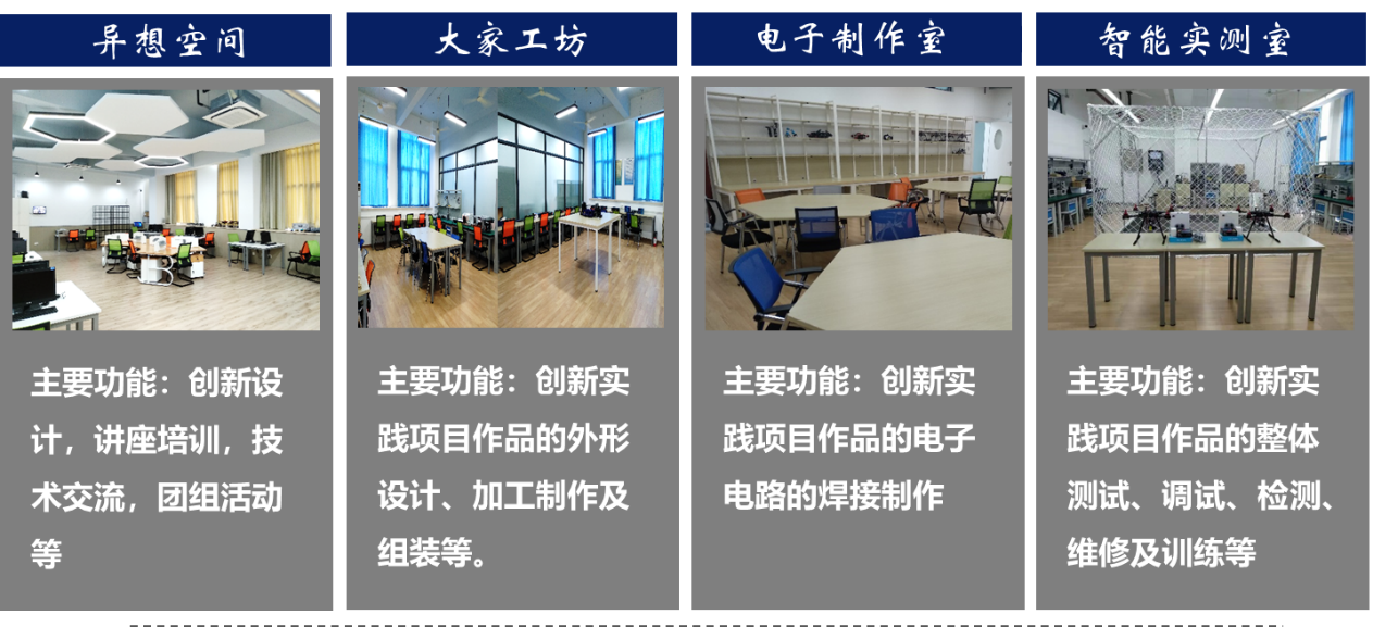 结合高新科技,针对学生兴趣,构建创新实践项目平台,E2创智天地开发建设有无人飞行器创新实践平台、智能物流机器人实践平台和智能小车创新实践平台等3个创新平台,后续建设中智能物联网创新实践平台、智能水面/水下航行器创新实践平台,以及筹建中光学成像(3D-VR/AR、全息成像)创新实践平台等。