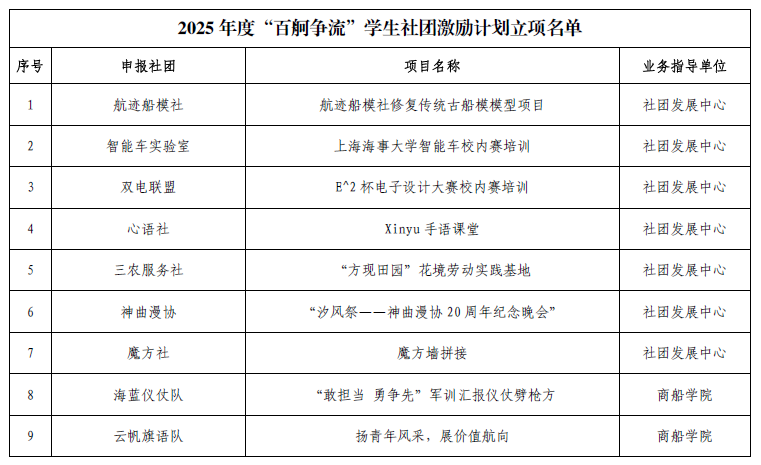 2025年双点联盟进入:2025年度“百舸争流”学生社团激励计划立项名单