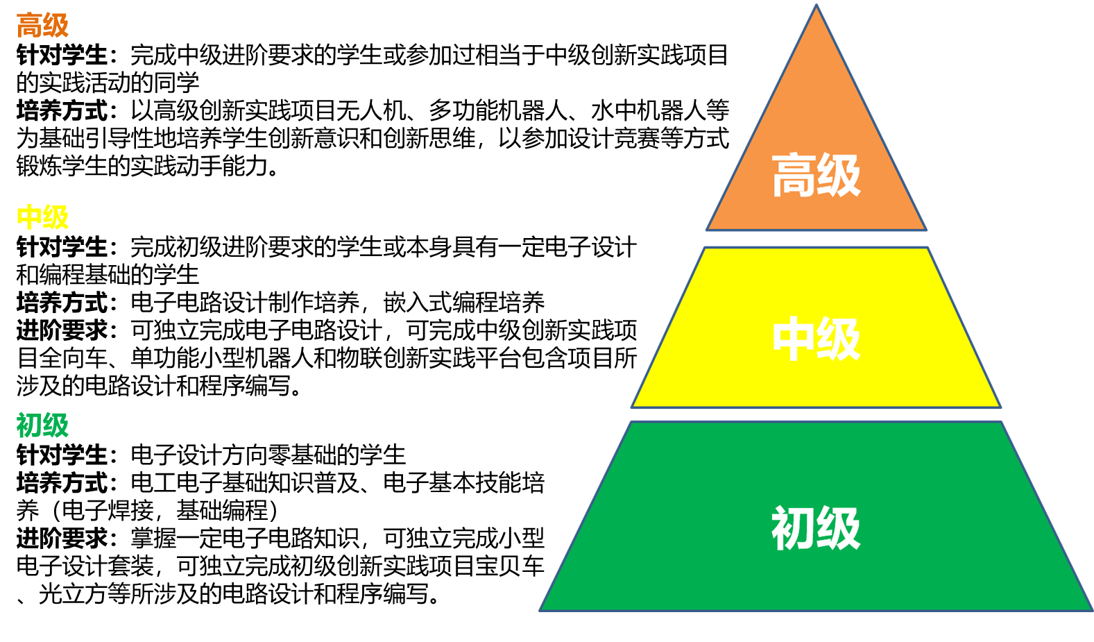 根据学生的知识结构和基本技能的不同,建立进阶式创新实践培养模式。分为初级、中级和高级三个层次,针对在电工电子创新设计方面不同基础的学生进行引导性培养。