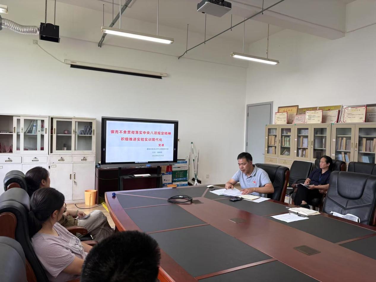 为深入贯彻落实八项规定精神,弘扬党的光荣传统和优良作风,2025年6月25日下午,在工训216会议室,基础实验实训中心直属党支部唐建新书记以“锲而不舍贯彻落实中央八项规定精神积极推进实验实训现代化”为主题,给党支部全体党员讲授党课,毛奇凰主任列席。