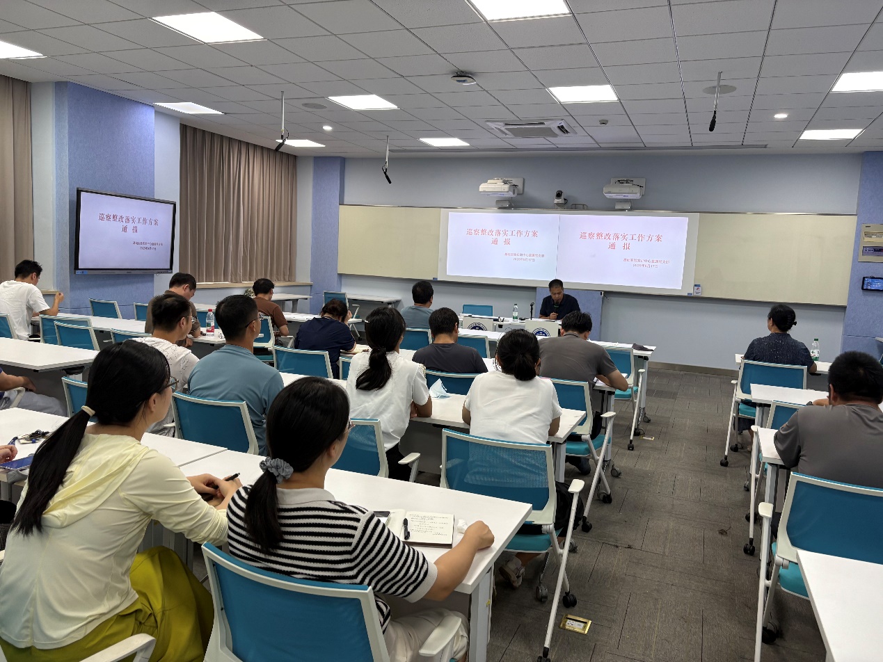 唐建新书记通报巡察整改落实工作方案,针对上级巡察反馈意见,中心制定了详实的整改方案,明确了具体整改措施、责任分工和完成时限。会议要求全体教职工切实提高政治站位,高度重视整改工作,以最坚决的态度、最扎实的举措确保各项整改任务落到实处、取得实效,以巡察整改为契机建立和完善部门体制机制,全面提升中心各项工作水平。